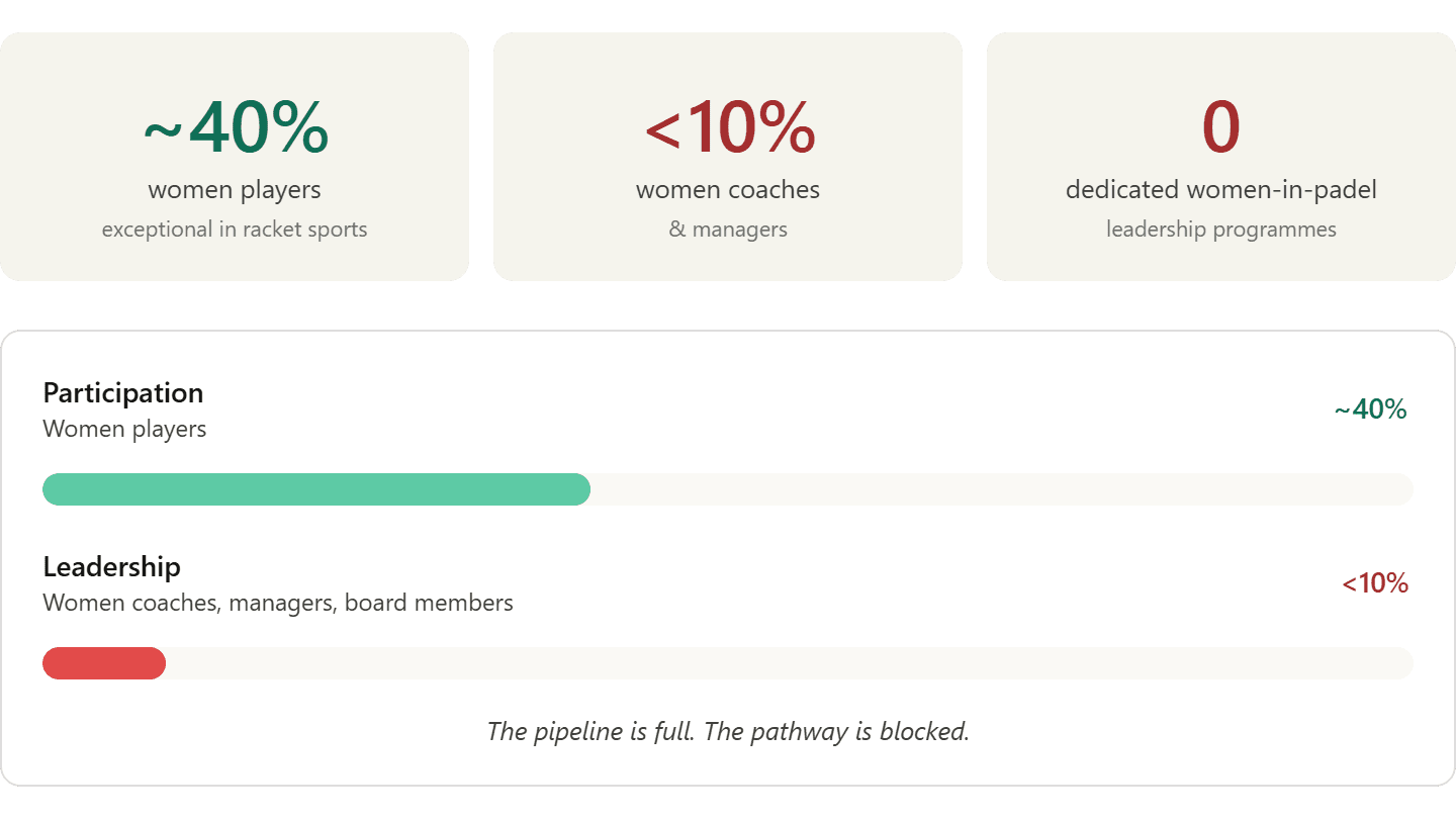 Padel has achieved something exceptional in racket sport: approximately 40% of its player base is female. This is significantly higher than tennis, squash or badminton at grassroots level. Yet fewer than 10% of coaches, managers and federation board members are women.