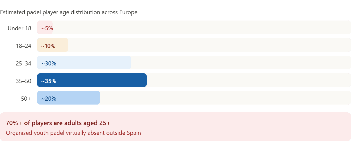 The majority of padel players are 25–50 year-old adults. Organised youth padel is virtually absent outside Spain.
