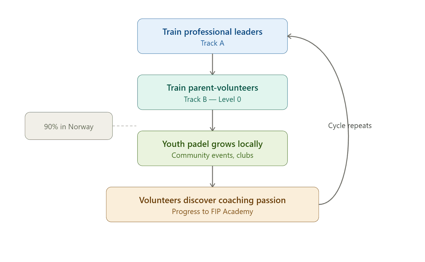 A "Level 0" programme, free, multilingual, grassroots-focused, that trains padel-playing parents as youth coaches. This creates the workforce that doesn't currently exist and feeds into FIP Academy's professional certification.