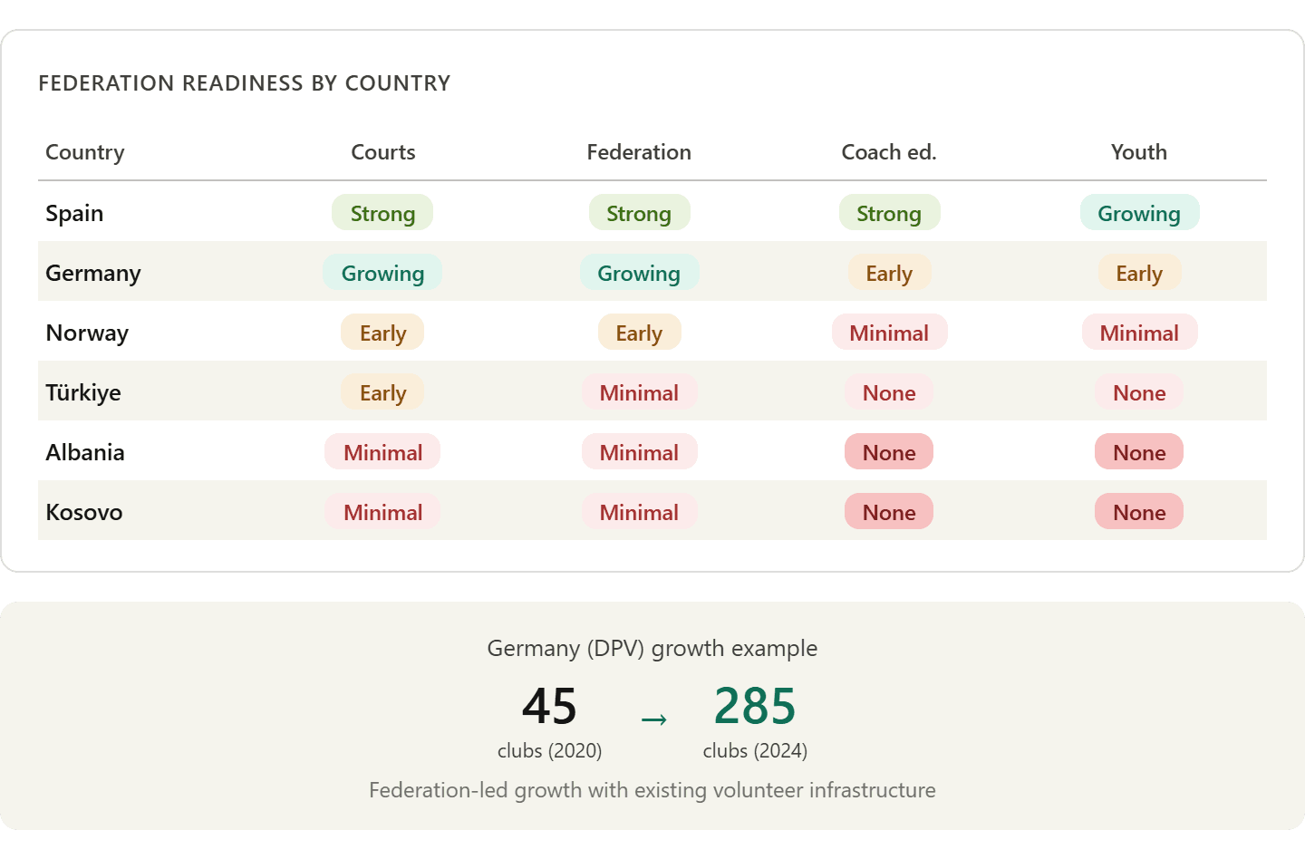 The pattern repeating across the Balkans, Türkiye and Eastern Europe is consistent: commercial investors build courts, players appear, but without federation capacity the sport remains a leisure activity rather than a structured sporting ecosystem.
