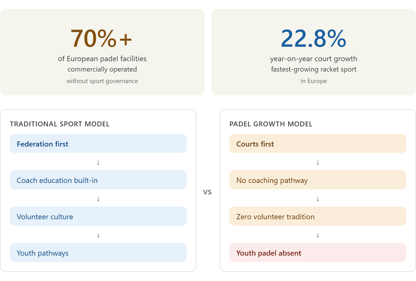 Padel is Europe's fastest-growing racket sport. 35+ million players, 77,300+ courts, 22.8% year-on-year growth. The numbers look spectacular. But behind the headline growth, a structural imbalance is deepening: courts are being built, but federations, coaching systems and youth pathways are not.