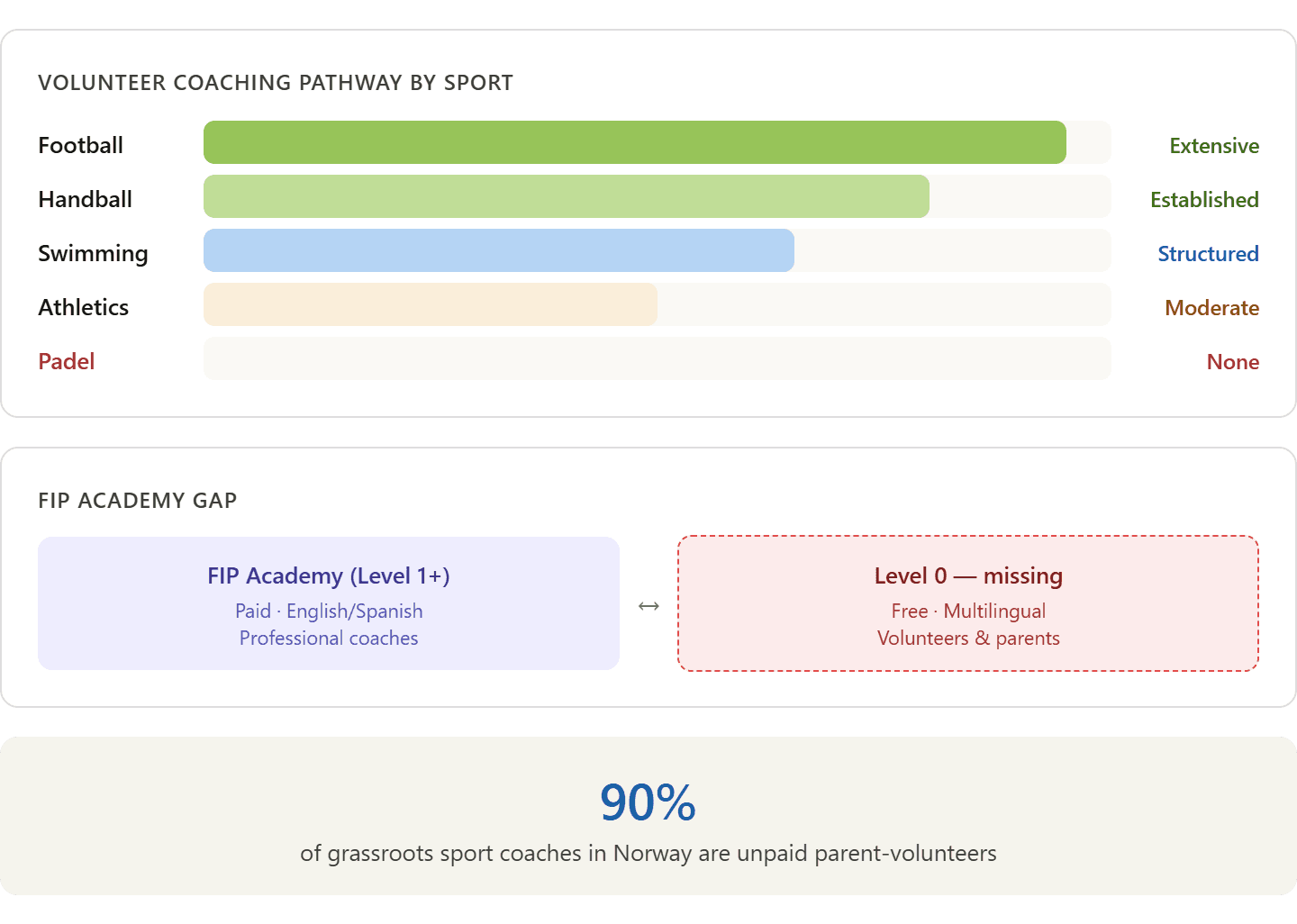 European grassroots sport runs on volunteers. In Norway, 90% of grassroots sport coaches are unpaid parents. These same parents play padel, and many already volunteer in their children's football, handball or swimming clubs. But padel has no volunteer coaching tradition whatsoever.