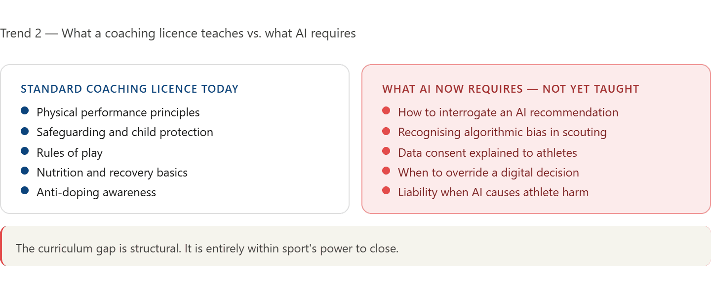 Coaching licences, federation certification programmes, and volunteer training pathways have been built around physical performance, safeguarding and rules of play. None have systematically integrated AI literacy. A coach completing a UEFA B Licence today will learn nothing about how to interrogate an AI-generated training load recommendation, assess whether a scouting algorithm encodes bias, or explain data consent to an athlete's family.