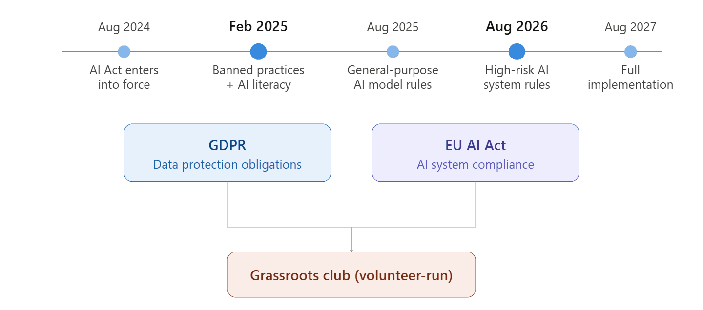 Combined with GDPR, this creates what can be described as a "dual compliance burden" for grassroots clubs. The same data is subject to parallel but distinct obligations under both frameworks, data protection requirements under GDPR and AI system compliance requirements under the AI Act. For volunteer-run organisations with limited budgets and no legal expertise, navigating both simultaneously is effectively impossible.