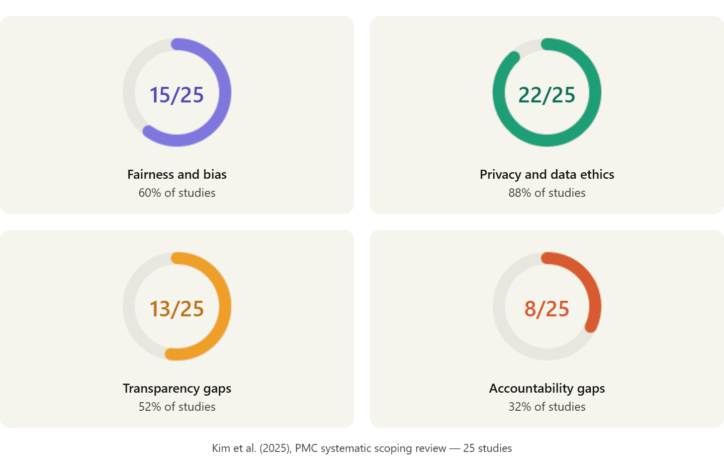 A systematic scoping review published in the Journal of Sport and Health Science (Kim et al., 2025) examined 25 studies on the ethical implications of AI in sport. The findings are sobering: 15 studies identified fairness and bias concerns, 22 flagged privacy and data ethics issues, 13 highlighted a lack of transparency and 8 found accountability gaps.